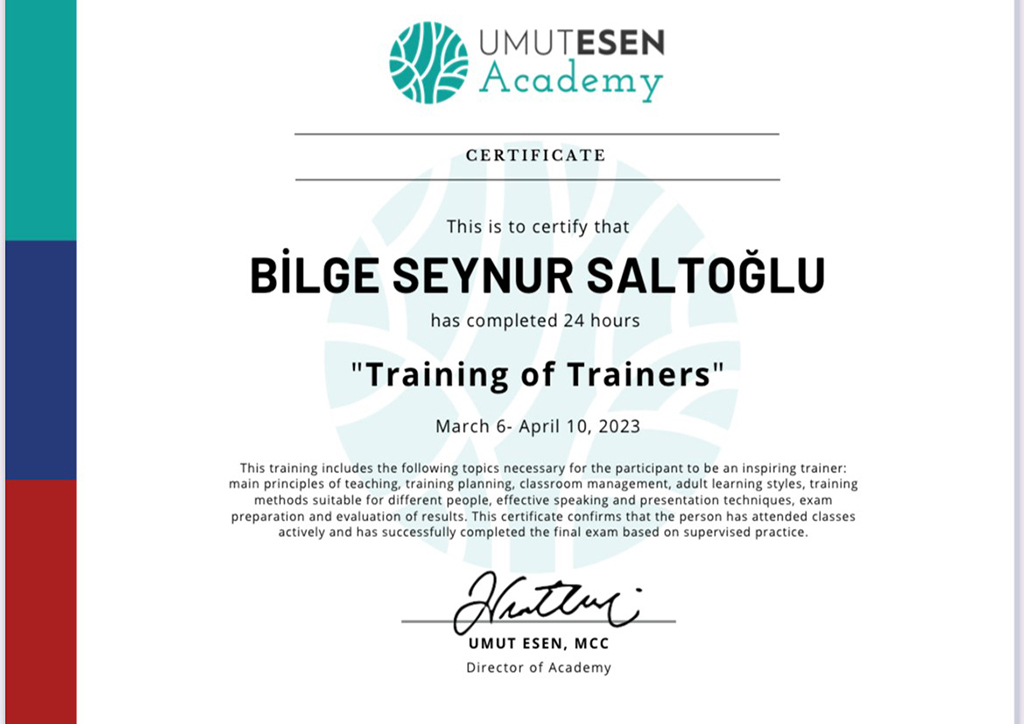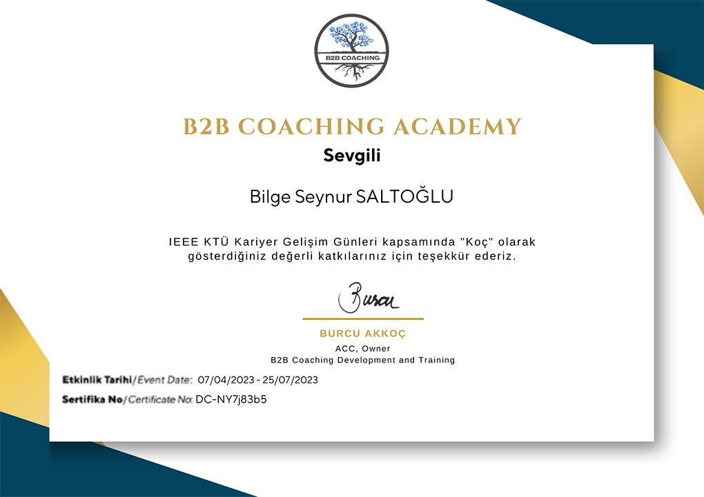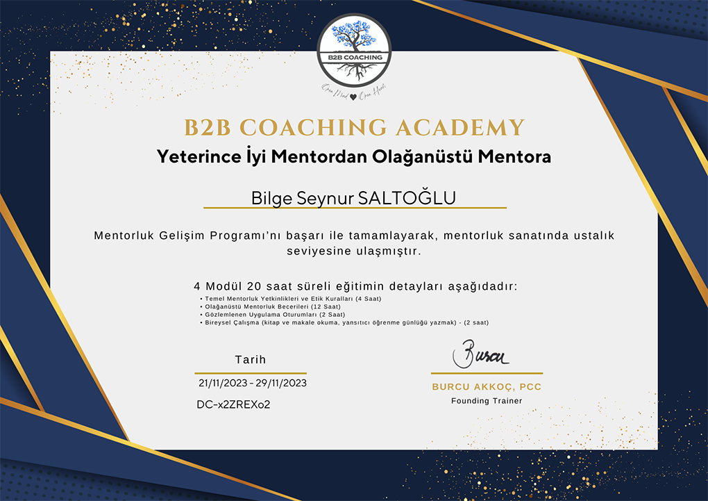 “Mutlu bir gelecek, ne istediğini bilen senden geçecek” ilkesini çalışmalarının merkezine alan Bilge Seynur Saltoğlu, 2008 yılından bu yana profesyonel iş yaşamının içinde yer almaktadır. Gıda sektöründe kurumlarla iş birlikleri gerçekleştirdiği ve Müşteri İlişkileri Yöneticiliği konumunda edindiği 14 yıllık kurumsal deneyimi boyunca insan odaklı çalışma yaklaşımını benimsemiş; bireyin potansiyelini ve liderlik kapasitesini merkeze alan gelişim alanlarına yönelmiştir.